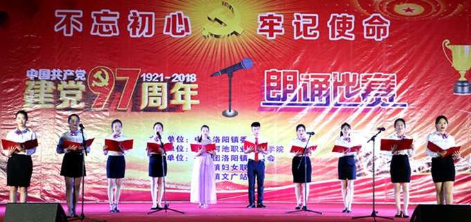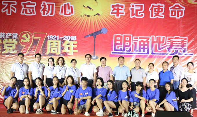 在中国共产党第97个生日来临之际,我院以及市职业教育中心学校受邀参加2018年环江毛南族自治县洛阳镇举办的中国共产党建党97周年“不忘初心、牢记使命”朗诵比赛。学院学工处、院团委、宣传部等部门相关负责人参加活动并担任评委。大学生艺术团成员、教师代表参加活动。