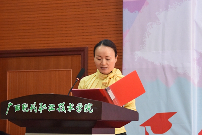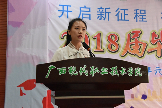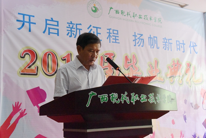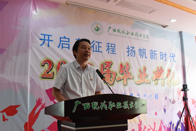 会上,院长黄绍光致毕业辞。黄绍光指出,2018届毕业生在校期间,学院加大投入,强化基础设施建设,教学质量稳定提高,办学实力和办学水平明显提升。在学院领导的带领下,师生们共同努力,创造了学院乃至广西、全国职业教育一个又一个奇迹。在毕业之际,黄绍光希望全体毕业生学会担当,做一个勇于担当、勇于负责的人;积极向上,做一个踏实肯干的人;不断学习,做一个终身学习的人;饮水思源,做一个知恩图报、爱校荣校的人。