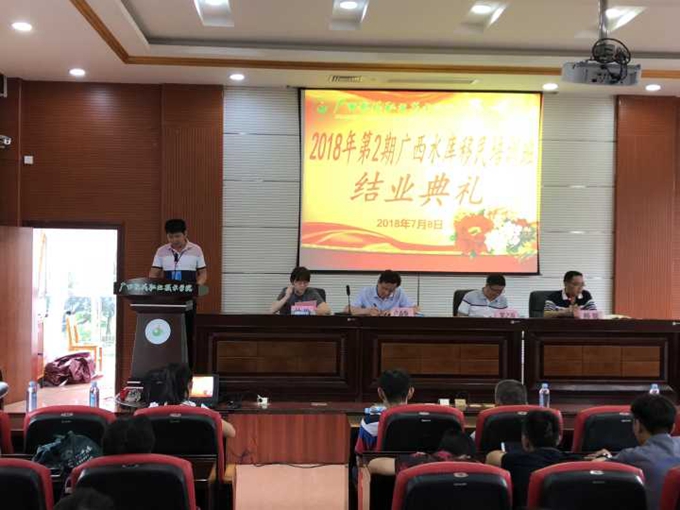 7月8日下午,我院在第二学术报告厅召开2018年第2期广西水库移民培训结业典礼。学院院长助理卢森焕出席会议。南宁市、柳州市、桂林市、北海市等移民工作管理局领队、学院培训部主任罗之尚以及本次培训班全体学员、指导教师、班主任参加会议。会议由学院培训部副主任韩锐主持。