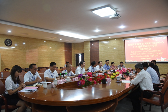 9月3日,越南国家商务部下属PIE培训中心总经理阮友青、副总经理吴工青等一行3人到我院考察交流。院长黄绍光、副院长韦胜东陪同考察,并在图书馆会议室与来宾进行友好会谈。