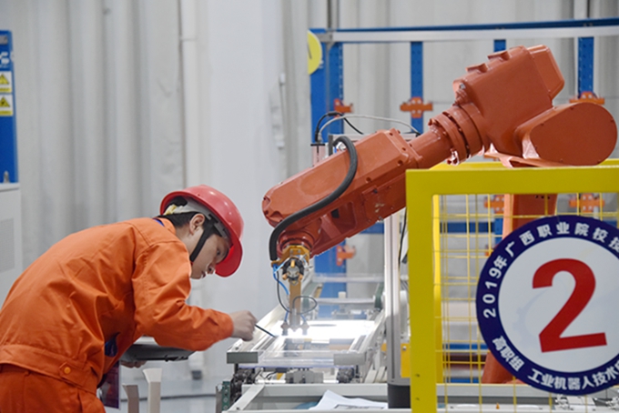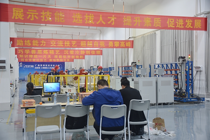 3月28日,2019年广西职业院校技能大赛“工业机器人技术应用”、“机电一体化项目”2个赛项在我院鸣锣开赛,包括我院在内的全区15所职业院校共21支参赛队伍进行角逐,55名来自各职业院校的选手在比赛中展示技能。比赛时间为3月28日至29日。 据悉,“工业机器人技术应用”赛项是以工业机器人智能工作站系统作为竞赛平台,多名参赛选手协作完成工业机器人应用工作站系统中的配套设备机械电气系统的装调、工业机器人标定及示教器示教编程、通讯设置及操作编程等基本工作任务,并通过对系统的人机界面开发及控制程序设计等完成工业机器人智能工作站系统的联机运行和特定制造流程等综合业务;“机电一体化项目”赛项比赛任务包含电路设计、气路设计、工业机器人编程与调试、可编程控制器编程与调试等知识与技能点。 赛场内,各赛项参赛选手专注认真,沉着比赛,展现了职业院校学子扎实的技能水平和良好的精神风貌;各赛项裁判员严格、严肃、认真,确保比赛公正公平。 我院作为2个赛项的承办单位,为使比赛顺利成功举办,我院高度重视,提前谋划、精心布置、充分准备,各项工作获得了裁判员和各职业院校参赛队的一致好评。通过举办技能大赛,进一步推动了职业院校相关专业深化教育教学改革,达到了以赛促教、以赛促学。同时也为职业院校的学子创造了交流经验、切磋技艺、展示水平的舞台,鼓舞和激励广大青年弘扬劳动光荣、技能宝贵、创造伟大的时代风尚。