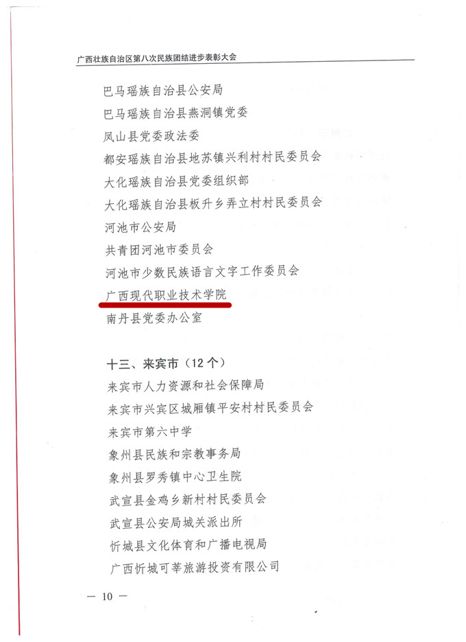 11月28日,广西壮族自治区第八次民族团结进步表彰大会在广西人民会堂举行,表彰在民族团结进步事业中作出突出贡献的模范集体和模范个人。优米体育入口官网下载手机版被授予“广西壮族自治区民族团结进步模范集体”荣誉称号。 多年来,我院高度重视民族团结进步创建工作,始终把促进民族团结进步摆在突出工作位置,充分发挥教育服务民族地区的作用,为培养民族人才、推进民族关系和谐做出了积极的贡献。