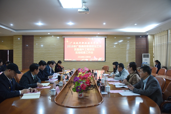 11月8日上午,我院在图书馆会议室召开2018年广西高校思想政治工作质量提升工程项目实地检查工作会议。由桂林理工大学副厅级调研员、教授张劲松为组长的2018年广西高校思想政治工作质量提升工程项目检查组到我院对“三全育人”相关工作进行检查指导。学院党委书记韦伟松、院长黄绍光、副院长韦胜东、南宁职业技术学院商学院原院长韩江河等领导出席会议。“三全育人”工作各项目组负责人、各系党总支书记、主任等参加会议。会议由院长黄绍光主持。 会上,与会人员观看了我院“三全育人”宣传片。张劲松组长表示,按照自治区教育厅有关要求,此行主要目的是为了检查我院“三全育人”各项目的进展情况、项目资金支出情况等。 学院党委书记韦伟松从“三全育人”工作的领导、激励保障措施、强化经费保障、主要工作亮点、存在问题和下一步工作打算等方面作学院“三全育人”工作情况汇报。韦伟松指出,通过“三全育人”工程项目的开展,全体教职工利用各种途径在各自岗位上开展育人工作已成为自觉;“三全育人”工作的实施推进,极大提高了学生满意度,也使学生综合素质得到很大提高,学院的社会影响力不断提升。下一步,学院将在全面扎实推进十一项育人工程的基础上,重点在德育核心团队建设、读书工程、育人教书、科研工作和“三全育人”的思想创新上实现重大突破。 听取汇报后,张劲松组长肯定了我院“三全育人”工作有成效、有亮点,主要体现在民族文化项目有特色、管理育人有实招、读书活动创新意。张劲松建议,下一步学院要在相关项目上再挖掘亮点、再发挥优势,整体推进“三全育人”工作深入有效推进。 汇报会结束后,检查组一行查阅了我院“三全育人”工作相关资料台账,实地检查了24小时图书馆、“马上办”服务中心、民族艺术(壮族蚂拐歌)传承创新职业教育基地、青年之家和易班工作站等。