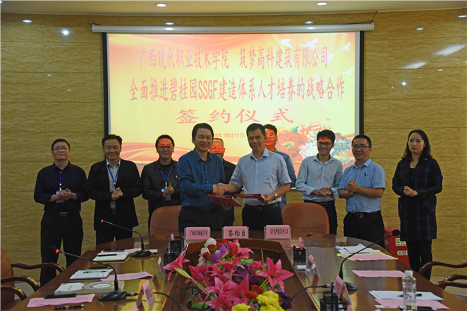 10月11日上午,我院与碧桂园旗下筑梦高科建筑公司举办了校企合作签订仪式。学院院长黄绍光,碧桂园筑梦高科建筑有限公司广西区域负责人莫大瑞,碧桂园广西区桂西城市公司项目总经理李东,碧桂园广西区域人力资源经理黄乾赠,碧桂园广西区桂西城市公司河池项目总经理陆德恩、助理唐晓,学院老领导覃志航及相关部门负责人、建筑工程系相关教师参加了签约仪式。 会议由建筑工程系主任胡万志主持,与会人员首先观看了“SSGF”技术用于建筑现场的视频实例。接着,筑梦高科公司广西区域负责人莫大瑞、学院院长黄绍光分别作了重要发言,双方就围绕建立全面战略合作关系进行了深入交流讨论,并就学院学生的合作培养、顶岗实习、师资培训、就业、SSGF相关课程等方面达成了共识。 近年来,随着建筑信息化、产业化的快速发展,建筑新技术新工艺的不断创新,对建筑类专业建设和教学提出了新的挑战和要求。为适应建筑类新型人才创新发展的培养要求,学院积极实施专业人才培养模式改革和课程体系重构,加强产教融合,校企合作,寻求能为学院学生提供创新型技术培养的社会平台。“SSGF”为科技创新、安全共享、绿色可持续、优质高效的简称,通过本次合作,不仅拓宽了企业的人才培养和选拔模式,也为学院开辟了新的校企合作和顶岗实习渠道。
