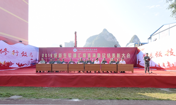 金秋九月,硕果累累。9月29日,我院在田径场隆重举行2018级新生军训汇报表演暨总结表彰大会。学院党委书记韦伟松、院长黄绍光、河池市金城江区人民武装部政委孔祥峰,市职教中心党委副书记、副校长何成相等领导出席。学院各职能部门负责人、2018级新生、全体带训教官、2018级班主任以及我院、市职教中心师生代表等参加。大会由学院党委副书记、副院长霍江华主持。