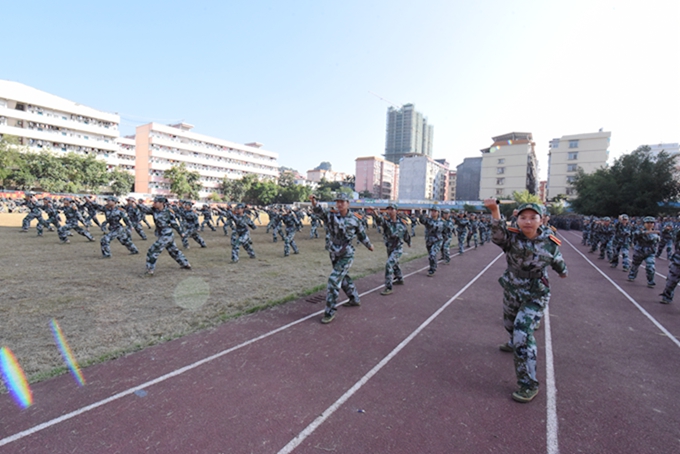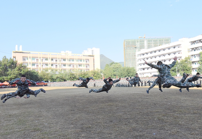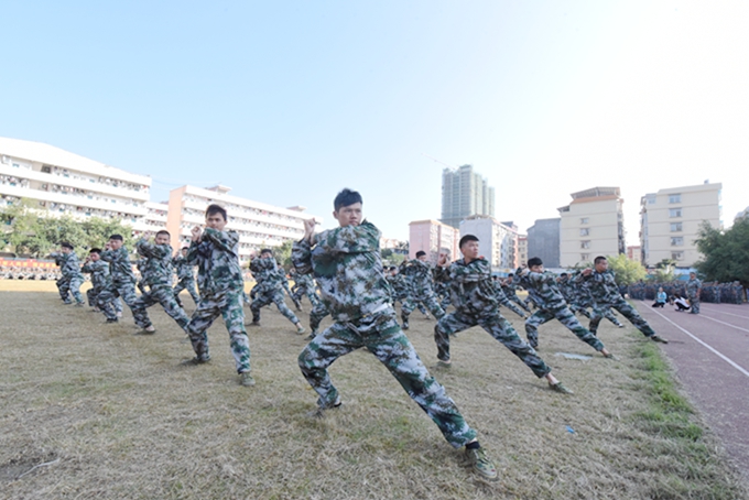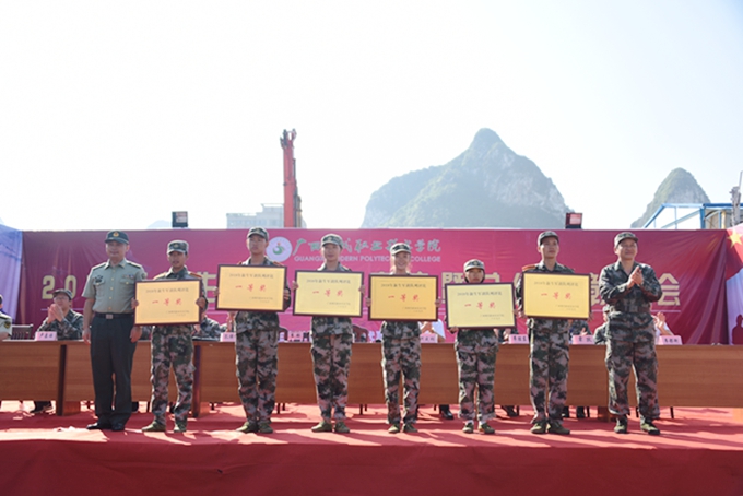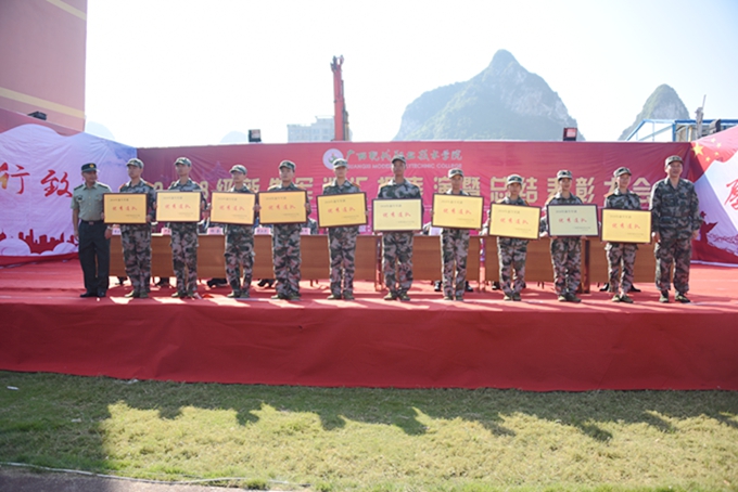 今年军训我院共有3700多名新生参加,编为6个营,68个连队,是我院历史上参训人数最多的一次。大会在庄严的国歌声中拉开帷幕。蓝天白云下,整齐有序的方阵队伍严阵以待。院长黄绍光宣布广西现代职业技术学院2018级学生军训汇报表演正式开始! 学院党委书记韦伟松在承训总教官的陪同下开始检阅军训方队,受训学生热烈回应,一声声“首长好”、“为人民服务”响彻校园,激情澎湃,士气高昂。 在激昂的分列式进行曲中,受检方队依次通过主席台,接受领导检阅,同学们口号嘹亮、步伐矫健、精神抖擞。在特色方队表演中,拼字方队有序拼出大气震撼的“广西现代”四个大字,教官方队的倒功、摔擒尽显军人气魄,男生方队的擒敌拳一招一式虎虎生威,女生方队的匕首操、特色军姿舞蹈也英姿飒爽、毫不逊色,方队合唱唱出了激情豪迈……精彩的表演赢得阵阵掌声和欢呼声,同时也充分展示了我院的军训成果。 院长黄绍光在大会上讲话。黄绍光代表学院对参加军训的全体同学、班主任和班助表示亲切慰问,向全体承训官兵表示衷心感谢。黄绍光指出,半个月来,同学们不畏艰苦,风雨无阻,学习了军事知识和技能,增强了国防意识和安全意识,领略了现代军人的气质和品格,培养了集体意识和荣誉感,以优良的表现完成了军训任务。对于2018级新生接下来的大学生活,黄绍光希望,每一位同学都要要正确认识自己,看清形势,以坚定的信心和饱满的热情,自觉面对学业的挑战、就业的挑战、人生的挑战,积极主动做好大学生活中的每一件事情;要勇敢地追求幸福,在学习中、实践中感受幸福,在修炼自我、全面提升学习能力、思维能力、判断能力和创造能力的过程中收获幸福;要明确肩负的责任,树立正确的人生观和价值观,以理性的思维和发展的眼光看待问题,尽快让自己厚重和成熟起来;要严明学习纪律,在以后的学习和生活中,把在军训中表现出来的思想境界、意志品质、组织纪律和团结互助,拼搏向上的精神坚持下去,体现到校风和学风中,不断激励自己向新的目标迈进,努力成为无愧于时代要求的大学生。 河池市金城江区人民武装部政委孔祥峰在会上讲话。孔祥峰指出,学生军训是以爱国主义为核心,以增强国防观念为主要目的,引导青年学生爱国奉献、崇文尚武的一门课程,也是广大青年学生接受国防教育的有效形式。军训期间,全体参训同学克服困难,发扬了团结、紧张、严肃的优良传统,勇于吃苦,勇于锻炼,全面提高了自身素质,圆满完成了本次军训任务。通过本次军训活动,进一步加深了军、校双方的联系,老师、同学和教官们结下了深厚友谊,希望同学们继续发挥特别能吃苦、特别能战斗的优良传统,继续为学院发展做出更大的贡献。 会上,学院副院长韦胜东宣读《2018级新生军训工作先进集体、优秀教官和先进个人名单》。在2018级军事训练中,共评选出10个优秀连队、178名优秀训练标兵、25名优秀教官、28名优秀班主任、101名优秀工作者、141名优秀班助;25个连队在内务评比中分获一、二、三等奖,19个连队在队列评比中分获一、二、三等奖和精神文明奖。随后,出席大会的领导为获奖集体和个人颁奖。 最后,在同学们欢送教官的掌声中,我院2018级新生军训汇报表演暨总结表彰大会圆满落幕。