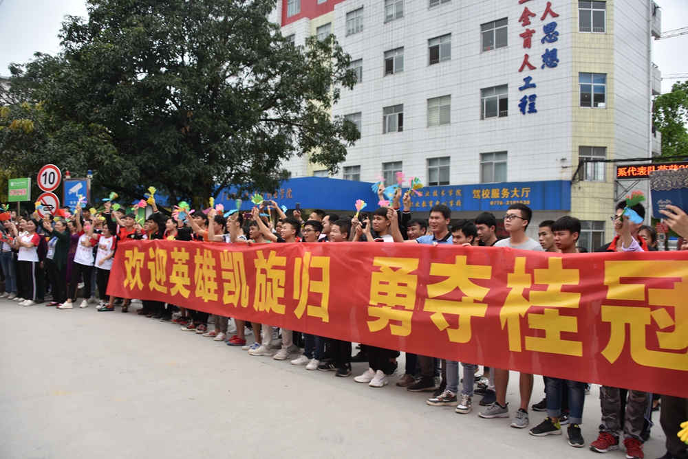 英雄团队回到学院时,全体师生夹道欢迎,怀着无比激动和自豪的心情高喊“自强不息,勇创一流”、“向英雄学习、致敬”等口号,用激昂的锣鼓声、欢腾龙狮舞姿、热烈的掌声和欢呼声欢迎英雄载誉归来。激动人心的欢迎仪式,感动了在场的所有师生,一位参加欢迎仪式的教育系学生深情地说:“今天看到凯旋而归的三位学长,作为广西现代职院的一名学生,我感到非常骄傲自豪,我将以他们为榜样,努力学好知识技能,朝着目标不断向上,不断努力。”