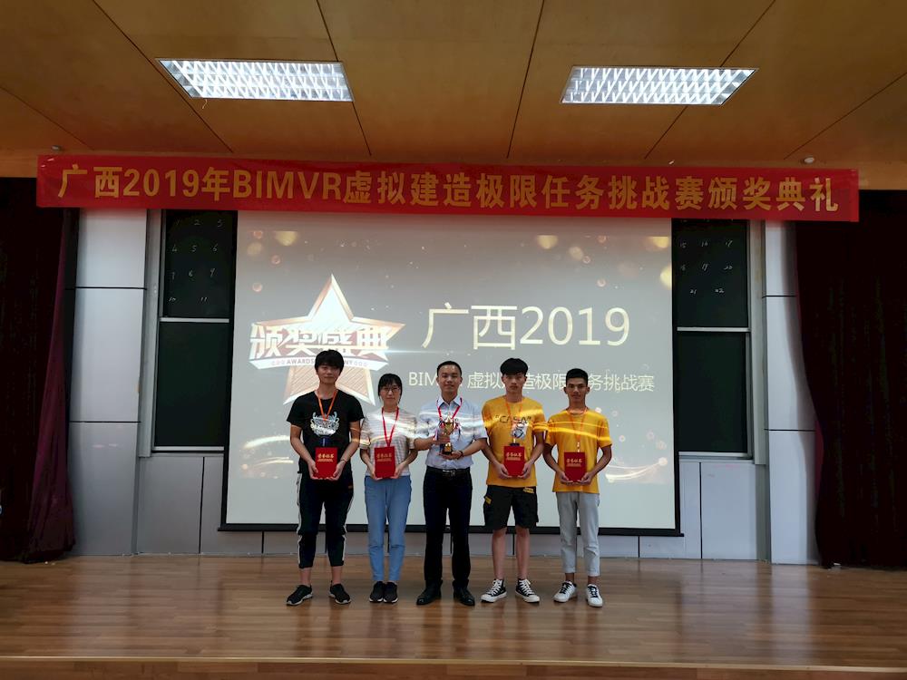 6月12-16日,由广西建筑职业教育教学指导委员会主办、广西科技大学承办的广西2019年“BIMVR”虚拟建造极限任务挑战赛在广西科技大学举行。此次比赛共有来自全区各本科院校、职业院校的23支队伍参赛。由我院建筑系解云霞老师和广西五建南宁分公司BIM中心陈少枫科长指导的学生罗旭升、凌永新、黄向前,经过5天的团结协作,在竞夺激烈的赛场上不畏挑战、顽强拼搏,最终以总分第一名的优异成绩斩获大赛特等奖,也实现了我院在此项赛事中特等奖的突破。