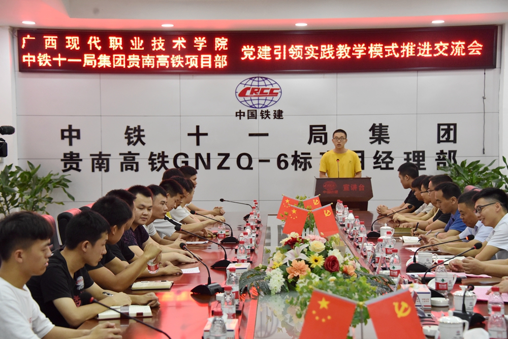 7月6日下午,作为党建共建单位,我院与中铁十一局集团有限公司贵南高铁项目经理部,在都安县贵南高铁项目总部召开党建引领·实践教学模式推进交流会。学院院长黄绍光、副院长韦胜东,中铁十一局贵南高铁项目党工委专职副书记宋东升等领导出席交流会。建信系主任胡万志、质管办、教科处相关部门负责人及学院建信系26名实习学生参加了交流会。会议由宋东升副书记主持。
