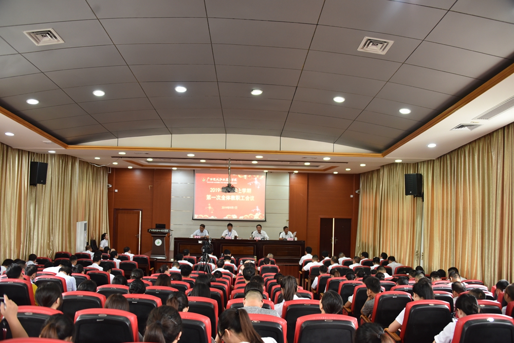 9月1日上午,我院在第二学术报告厅召开 2019—2020年上学期第一次全体教职工会议。学院党委书记韦伟松,院长黄绍光,纪委书记张斌,副院长冯忠伟,总顾问覃志航,院长助理韩江河、杨奎、覃孜出席会议,学院全体教职工参加会议。会议由副院长冯忠伟主持。