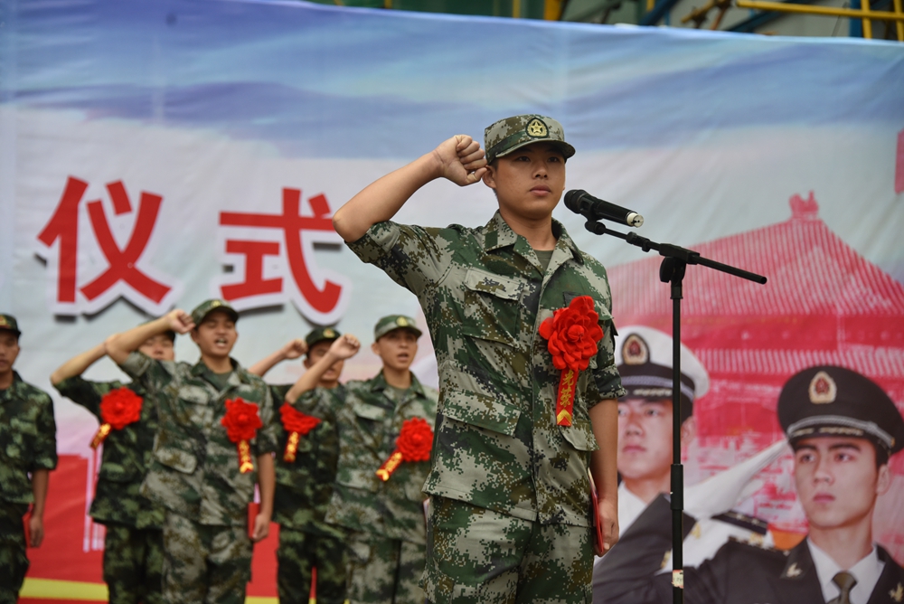 入伍学生进行庄严宣誓:我将以国家为重,以人民为重,刻苦训练,坚决服从命令,顽强拼搏,为学院争光添彩。