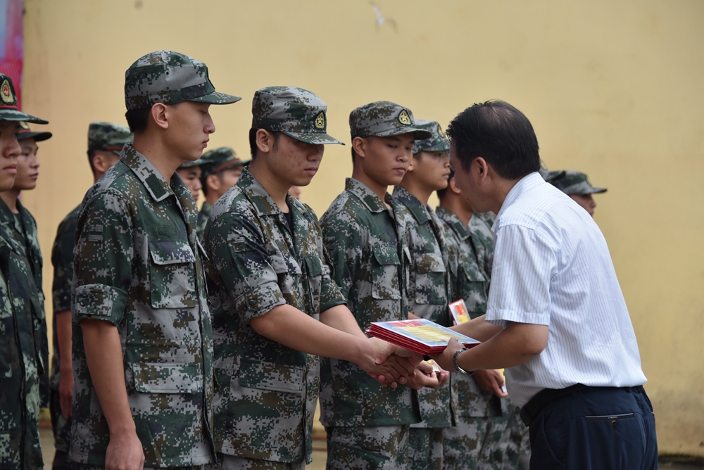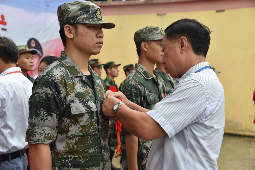 仪式上,韦胜东副院长宣读我院2019年在校应征入伍的学生名单,黄绍光院长给入伍学生颁发入伍通知书,学院领导给学生佩戴光荣花。