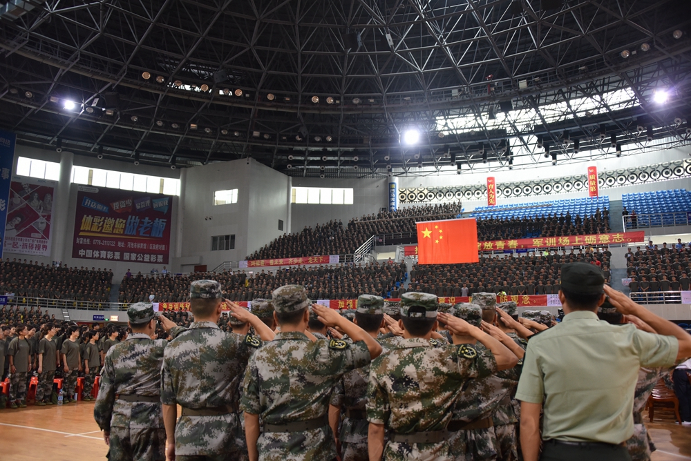 纪委张斌书记为军训营授旗,并宣布2019级新生军训开始。