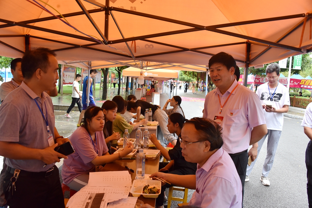 9月10日,学院党委书记韦伟松在院办、招生处、纪检办等相关部门负责人陪同下,对各迎新接待点坚守一线阵地的迎新工作人员进行慰问。