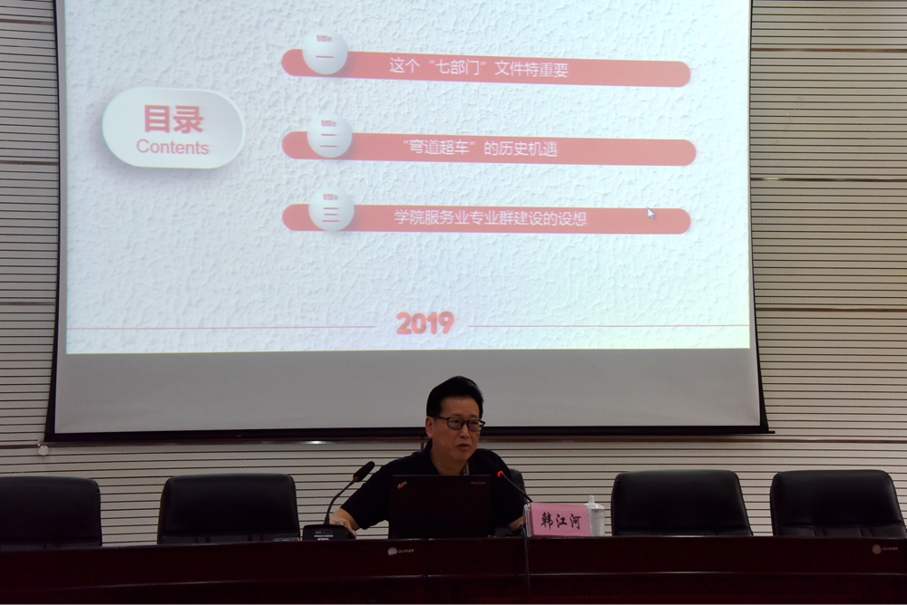 会上,韩江河教授详细解读了教育部等七部门《关于进一步加强职业教育工作的若干意见》的文件。韩教授指出,近年来,国家提出“健康中国”战略,大力支持康养文旅产业发展,这正是我院“弯道超车”的历史机遇。韩教授还针对康养文旅产业,为学院服务业专业群建设提出了许多意见和建议。韩教授强调,河池是首个地级“世界长寿市”,我们应该把握这个历史机遇,针对社会服务新需求,聚焦专业人才供给,以职业教育为重点抓手,提高教育对社会服务产业提质扩容的支撑能力,加快建立健全紧缺领域人才培养培训体系,扩大人才培养规模,全面提高人才培养质量,支撑服务产业发展,为服务河池市地方特色产业经济发展做出贡献。
