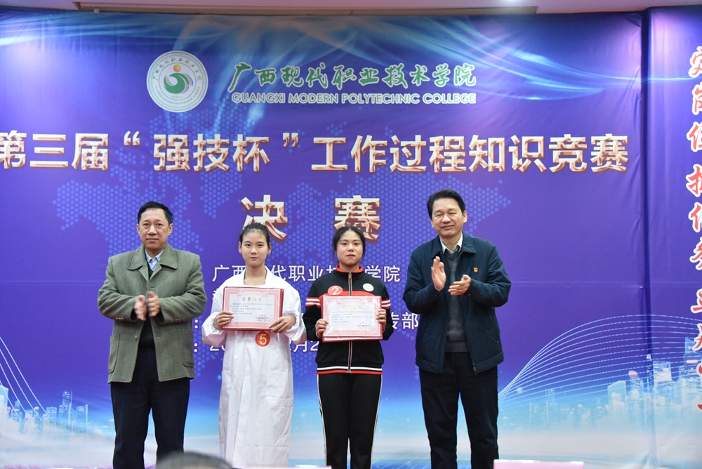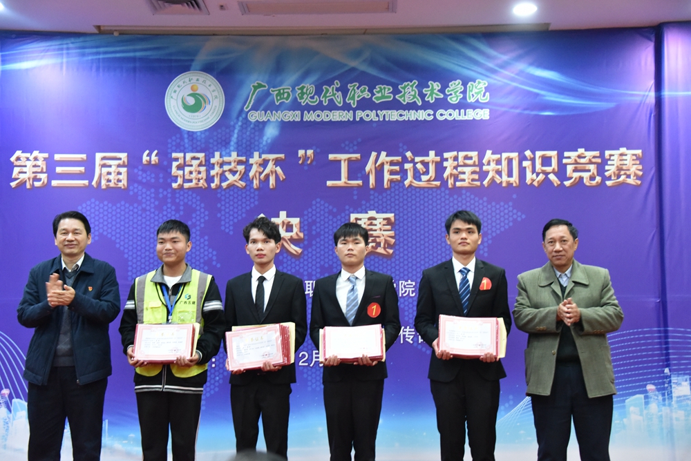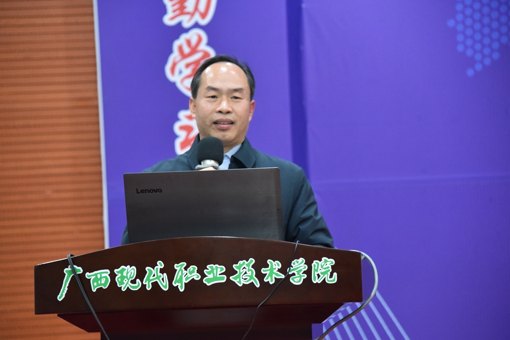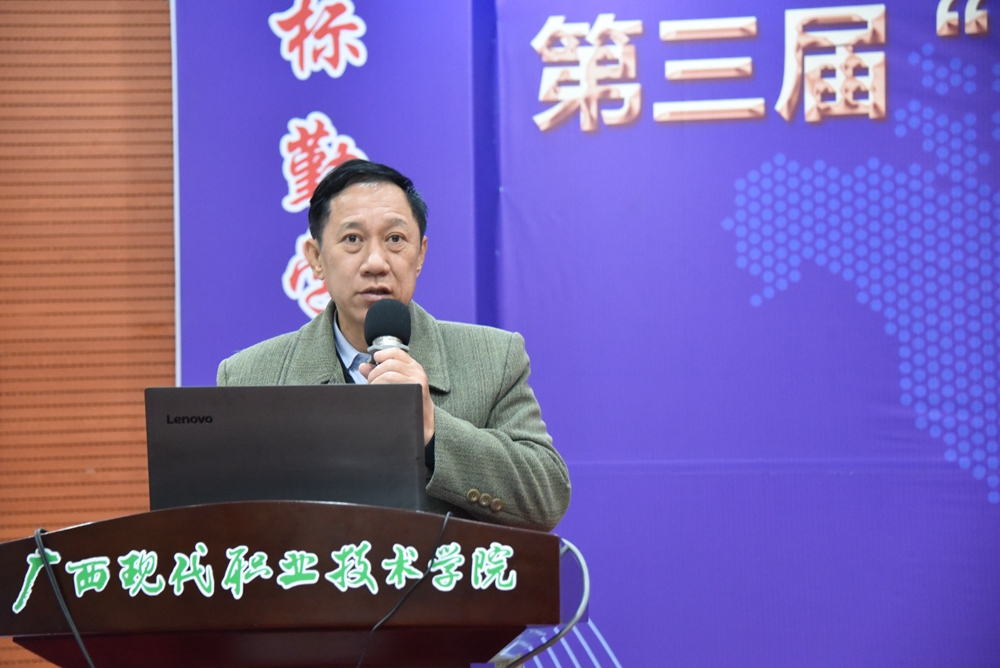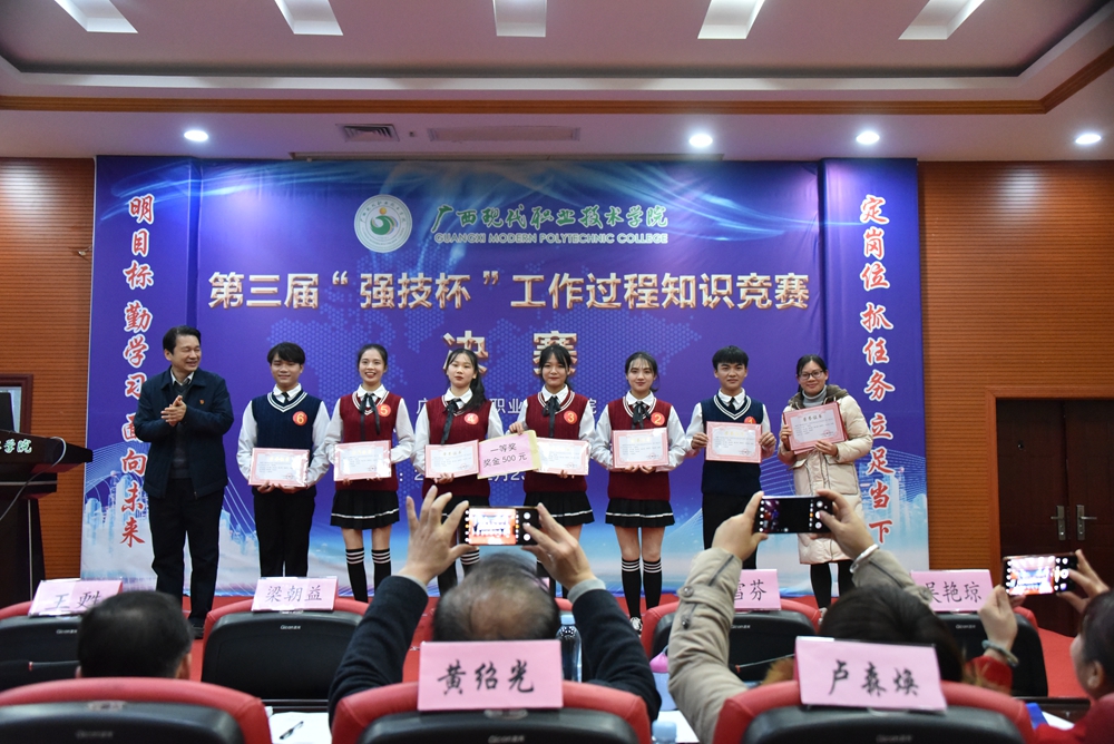 定岗位抓任务立足当下,明目标勤学习面向未来——我院第三届“强技杯”工作过程知识竞赛于12月23日下午在第二学术报告厅举行。学院院长黄绍光、副院长韦胜东出席本次比赛,市职业教育中心学校副校长唐启焕莅临现场观看并担任评委。本次决赛采用现场直播方式进行,在第二学术报告厅设主会场,各个教室进行现场直播。