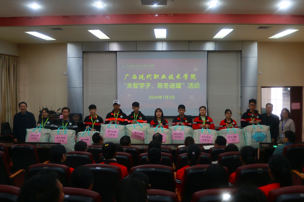 随后院长黄绍光、院长助理覃孜、学工处处长李铃给予学生代表赠送冬季暖心包,并到喷泉广场一起合影。本次活动充分体现了学院全体师生对贫困学子的爱心,真正把学院的关爱、温暖送到每个学子的心坎上,使他们切身感受到学院这个大家庭的温暖。