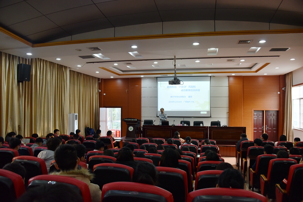 为进一步提高学生诚信意识,增强资助育人成效,促进国家助学贷款工作的顺利开展,12月11日,“2019年广西壮族自治区高校诚信巡回讲座”在第二学术报告厅举行。南宁市学生资助办主任莫尧出席并作报告,我院学生工作处处长李玲、副处长黄晓出席讲座,各系部辅导员(班主任)代表和受到国家助学贷款资助的学生代表到场聆听。