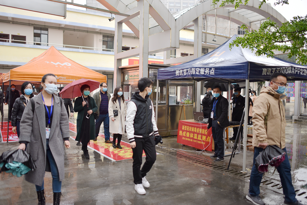 在学院大门外,设置了人员进校通道,进校人员前后间隔1米有序进入校门。在学院大门口设置体温检测点,检测点配备了体温热成像设备、隔离防护服、消毒液等,学生依次在校门等待区接受体温测量并做好记录,无异常才能进入学校;如发现异常,则进入复检流程,确定无异常之后才能进入学校。
