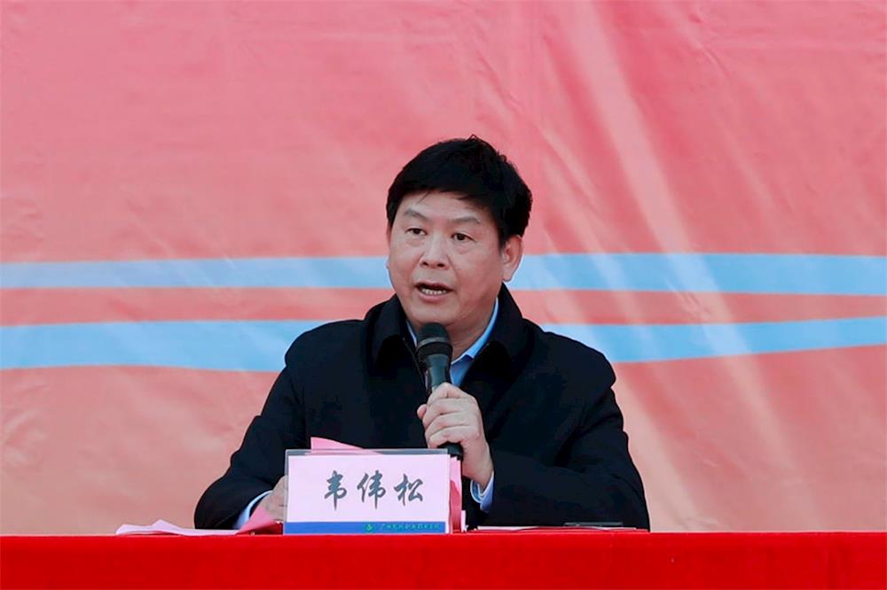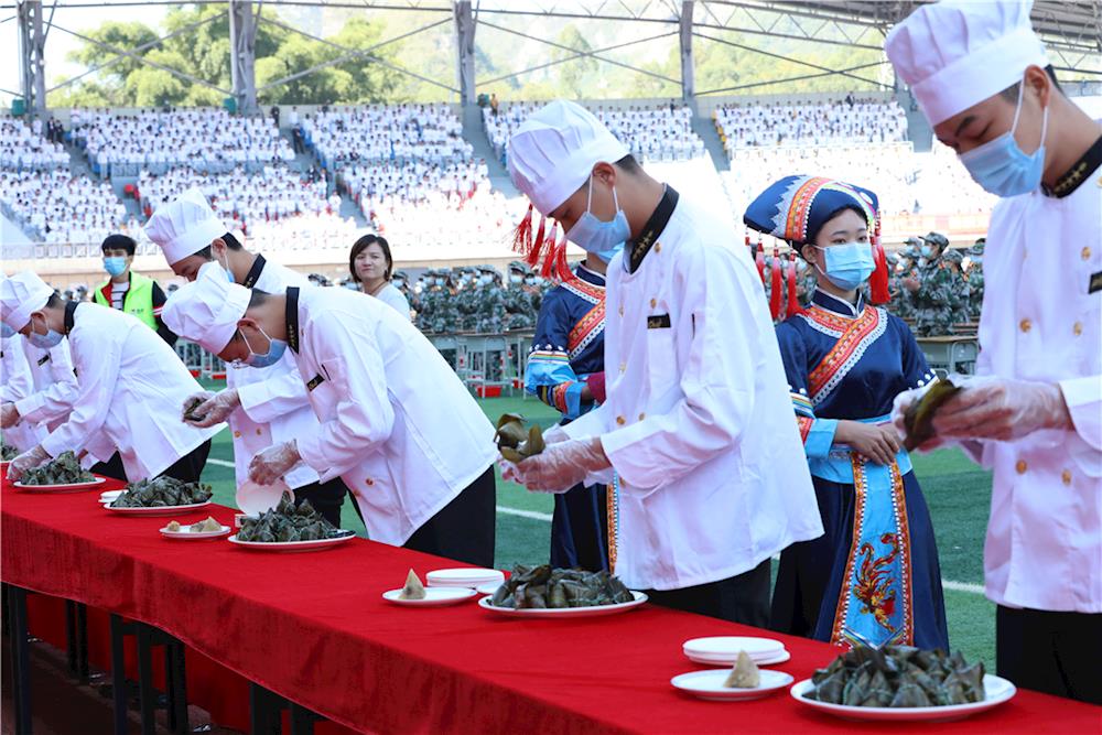 韦伟松在仪式上讲话。韦伟松指出,去年以来,我院和河池市职业教育中心学校联手组建粽子团队,并与区内外30多家实力雄厚的粽子生产企业开展校企合作。一年来,两校共投资近三百万元,用于粽子设备的采购和人才培养,两校粽子团队先后考察了区内外多家企业,采用本土绿色优质食材、加上科学配方、运用最新技术生产出味道鲜美“寿源粽”粽子,成为河池特产新名片。韦伟松表示,我院和河池市职业教育中心学校通过践行“三全育人”,传承优秀民族文化,培养学生热爱劳动的美德,为学生提供创业就业平台。作为广西“双高”院校建设单位和五星级学校,成立粽子产业学院,创建产教融合实训基地,打造与河池粽子产业链对接有特色竞争力的专业群,有助于培养高素质、具有创造力的粽子产业技术技能复合应用型人才。同时,通过粽子的生产,拉动本地区粮食、种养生产,扩大富余劳动力就业,能进一步服务河池经济和社会发展,助力河池脱贫攻坚。