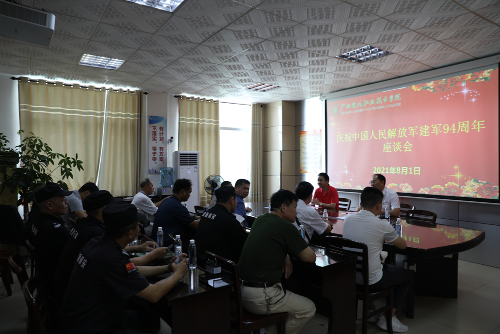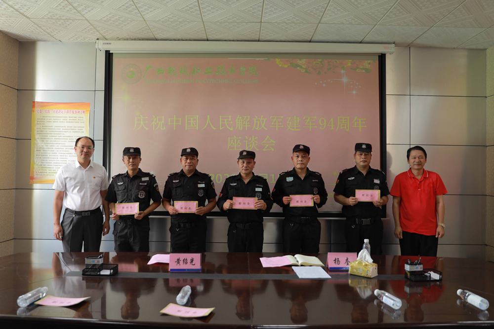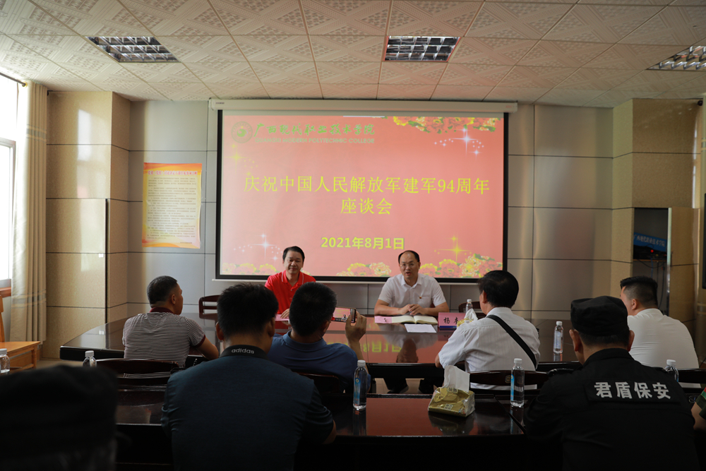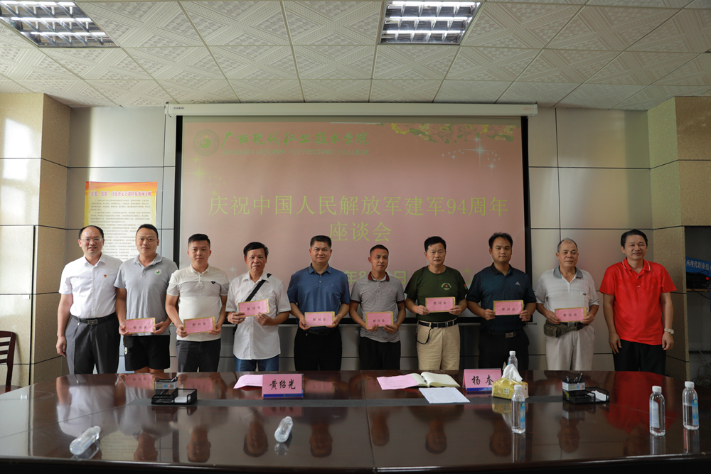 为庆祝建军94周年,切实做好拥军优属工作,展现我院党委对退役军人的关心关爱,8月1日上午,我院在一办五楼会议室召开 “八一”建军节座谈会。学院党委副书记、院长黄绍光,副院长杨奎出席座谈会,并为退伍军人发放慰问金。学院各相关职能部门负责人及全院退役军人参加座谈。会议由副院长杨奎主持。