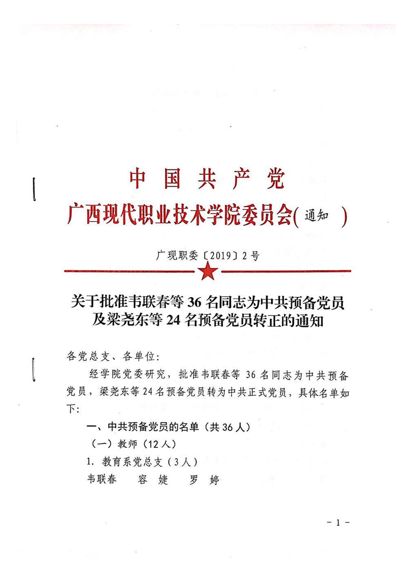 广现职委[2019]2号-关于批准韦联春等36名同志为中共预备党员及梁尧东等24名预备党员转正的通知 来源: 发布时间:2019-03-16 09:10:28 浏览次数: 次 【字体:小 大】 终审:gxxdxcb003 【打印正文】 相关信息