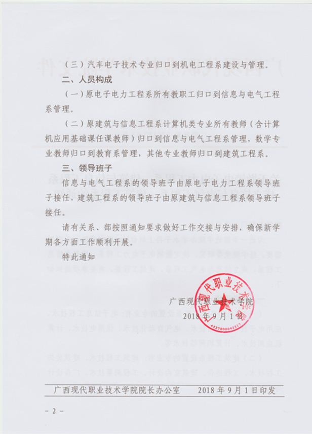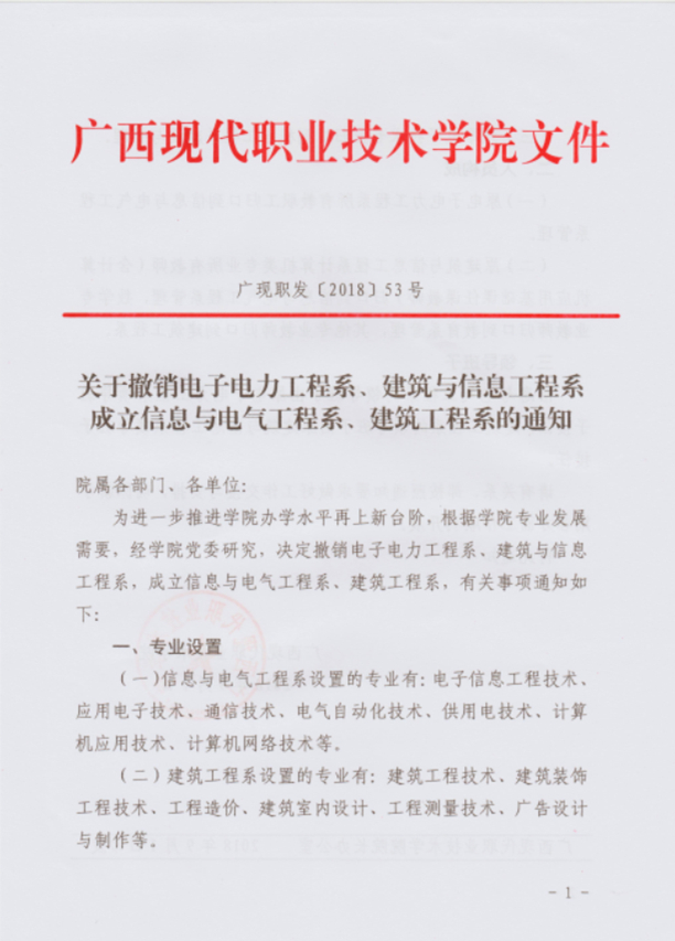 关于撤销电子电力工程系、建筑与信息工程系成立信息与电气工程系、建筑工程系的通知 来源: 发布时间:2018-09-17 18:15:00 浏览次数: 次 【字体:小 大】 广现职发〔2018〕53号 关于撤销电子电力工程系、建筑与信息工程系 成立信息与电气工程系、建筑工程系的通知.rar 【打印正文】 相关信息