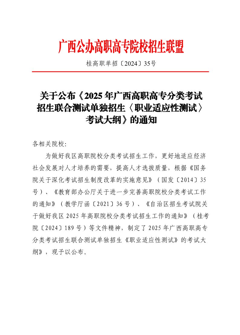 2025年广西高职高专分类考试招生联合测试单独招职业适应性测试考试大纲及样题 来源:文/ 广西公办高职高专招生联盟 发布时间:2024-12-13 16:36:13 浏览次数: 次 【字体:小 大】 终审:gxxdzsc001 【打印正文】 相关信息