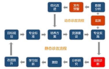 诊改是高职院校一项全面、深刻的变革,是按照“需求导向、自我保证、多元诊断、重在改进”的工作方针,以完善人才培养质量标准、制度,健全管理、监控机制,不断提高利益相关方对人才培养工作的满意度为目标,以构建和完善内部质量保证体系、提升信息技术水平、树立现代质量文化为任务,对学校、专业、课程、教师、学生五个层面实施诊断与改进,不断提高人才培养的质量。