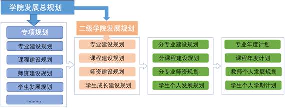 按照学校总规划-专项规划-二级院部子规划的思路和步骤,建立和完善专业建设规划、课程建设规划、师资建设规划和学生发展规划等规划体系,形成内部质量保证体系的目标链。二级院部应明确专业规划建设总体目标和具体目标,按照就业导向、全面发展、工学结合、校企合作的建设思路和高职教育的培养目标,加强培养模式、实训条件、师资和课程等建设,打造专业体系;以建设优秀核心课程为支撑,加强课程标准建设、设施设备建设和教学资源建设,打造课程体系;围绕全面深化改革要求,按照“分类管理、同步建设、突出重点、统筹兼顾”的思路,牢牢抓住“吸引人才、培养人才和用好人才”三个环节,紧紧把握师资队伍建设的内容、措施和保障等,打造师资队伍。