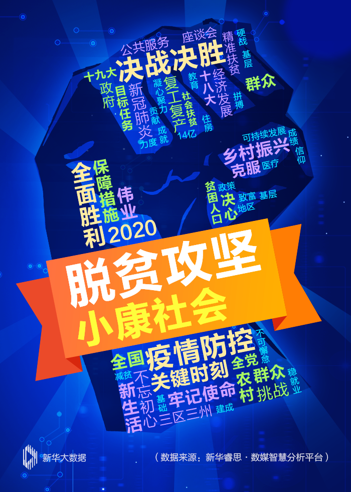 总书记的牵挂,也是网民的关注。新华睿思持续跟踪微博、抖音、今日头条等网上热搜榜高热话题,以及重大新闻事件,梳理出网民关注的热词集锦。根据关注度排行可以看出,“脱贫攻坚”“小康社会”两大关键词位居前列,“决战决胜”“全面胜利”“疫情防控”等也成为热搜词汇。