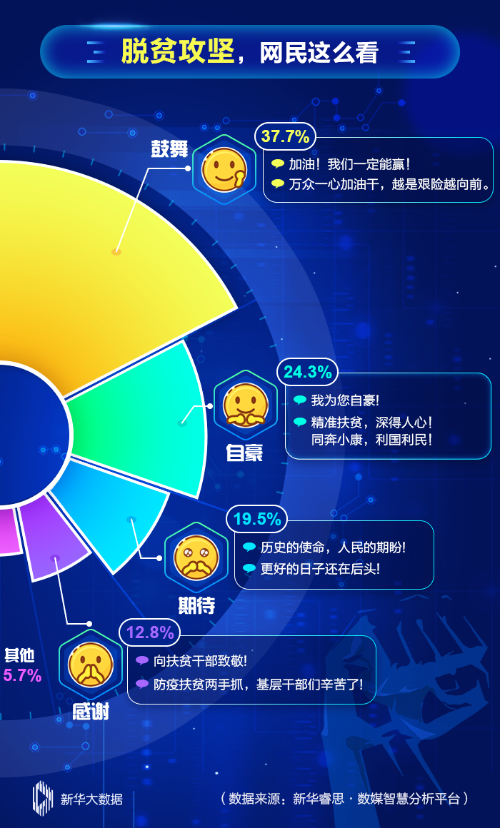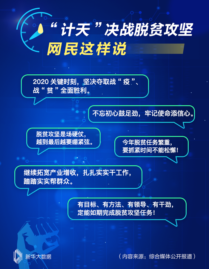 数据显示,倒计时冲锋之际,网民对脱贫攻坚非常关注。有网民留言称:今年脱贫任务繁重,要抓紧时间不能松懈;也有网民留言表示要扎扎实实干工作;还有网民留言表达对完成目标任务的信心:2020关键时刻,坚决夺取战“疫”、战“贫”全面胜利。