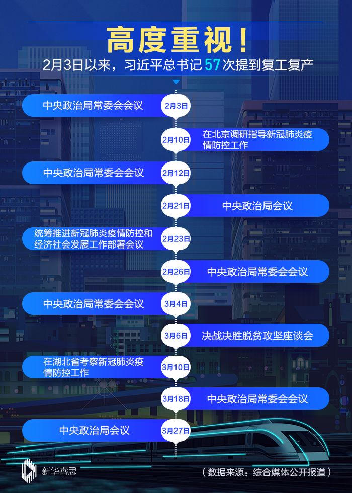 数据显示,自2月3日以来,习近平在不同场合共提到了复工复产57次,足见总书记对复工复产工作的重视和关注。